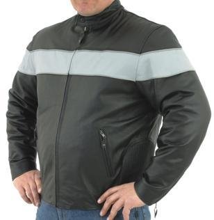 Mens Naked Cowhide Vented Leather Motorcycle Jacket with Grey Stripe & Reflective striping. Jacket has aZip Out Lining & Verticle Gathered Sides. Jacket Includes 2 Air Vents on the back & a Neck Warmer. - For Jackets best fit, order by chest size. How to get the correct fit, Please use a cloth tape measure to measure the circumference of your chest. If the measurement is an even number add 2 to get the next even number. If the number you get is an odd number add 1 to get the next even number. The general rule for a jacket is order the next even number. If the measurement is 46 order 48. If the measurement you get is 47, order size 48. If you don't have a cloth Tape measure, you can use a string and compare the length to a tape measure in inches. If you need further tips on measuring for a jacket, you can do a search for how to measure chest for a leather jacket and you will find some helpful hints.