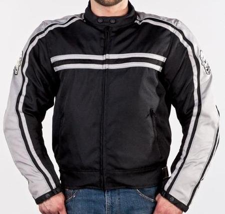 Armored Jackets, Mens Motorcycle Jacket with Removable Armor has Black & Grey Racing colors, a Zip Out Liner and air vents for cooling. Men's Armored Black &Gray Nylon MeshMotorcycle Jacket Z/O Lining. Zip Out Lining Jacket has Removable foam based CE Certified Armor on the back, shoulders and elbows Jacket also has Reflective Stripe on Jacket for safer riding at night. Jacket is lightweight, has multiple pockets, zippered cuffs and Zipper vent on back for warm days. Jacket Has Front and Back Vents. - For Jackets best fit, order by chest size. How to get the correct fit Please use a cloth tape measure to measure the circumference of your chest. If the measurement is an even number add 2 to get the next even number. If the number you get is an odd number add 1 to get the next even number. The general rule is order the next even number. If the measurement is 46 order 48. If the measurement you get is 47, order size 48.. If you don't have a cloth Tape measure, you can use a string and compare the length to a tape measure in inches. If you need further tips you can do a search for how to measure chest for a leather jacket and you will find some helpful hints