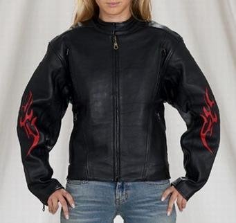 Women's Leather Motorcycle Jacket, Vented, Flames on Sleeves & back, Zip Out Lining Jackets, Womens Leather Motorcycle Jacket, Flames & Z/O Lining. Women's Jackets are made from Top Grade Genuine Leather with Fashionable Flame on Sleeves & Back. This Ladies Jacket features a Zip Out lining that runs through the sleeves. Jacket has air vents. - For Jackets best fit, order by chest size. Please use a cloth tape measure to measure the circumference of your chest / bust. Start from the center of your chest, run the tape measure under your arms around your back to the center of your chest. Measure fullest part of bust. When measuring jacket size, don't measure to tight, measure with your arms relaxed to the side. Add 1 inch to your final measurement. If you need further tips on measuring for a jacket, you can do a search for how to measure chest for a leather jacket and you will find some helpful hints, If you don't have a cloth Tape measure, you can use a string and compare the length to a tape measure in inches