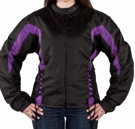 Womens Armored Black & Purple Textile Motorcycle Racing Jacket with Air Vents and Side laces for a better fit. Jacket is made from Extrememly Durable material with Removable padding onshoulder, elbows, & back. Jacket has Excellent Resistance to Wear & Tear with 2 Airvents on Front & 1 Airvent on the Back. Jacket also has Side laces for better fitting, Multi Pockets Inside & Out & Zippered Cuffs with snap closures. - For Jackets best fit, order by chest size. Please use a cloth tape measure to measure the circumference of your chest / bust. Start from the center of your chest, run the tape measure under your arms around your back to the center of your chest. Measure fullest part of bust. When measuring jacket size, don't measure to tight, measure with your arms relaxed to the side. Add 1 inch to your final measurement. If you need further tips on measuring for a jacket, you can do a search for how to measure chest for a leather jacket and you will find some helpful hints, If you don't have a cloth Tape measure, you can use a string and compare the length to a tape measure in inches