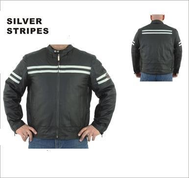 Mens Leather Racer Motorcycle Jacket with Silver Colored Stripes, Reflective Stripes for safer night riding. Jacket has Front & Back Airvents & includes a Zip OutLining. - For Jackets best fit, order by chest size. How to get the correct fit, Please use a cloth tape measure to measure the circumference of your chest. If the measurement is an even number add 2 to get the next even number. If the number you get is an odd number add 1 to get the next even number. The general rule for a jacket is order the next even number. If the measurement is 46 order 48. If the measurement you get is 47, order size 48. If you don't have a cloth Tape measure, you can use a string and compare the length to a tape measure in inches. If you need further tips on measuring for a jacket, you can do a search for how to measure chest for a leather jacket and you will find some helpful hints.