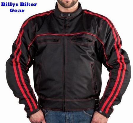 Armored Riding Jackets, Motorcycle Riding Jacket with removable Armor, Vented, Zip out Lining and Reflective Stripes, Mens Armored Black Motorcycle Jacket withRed Racing Stripes. Jacket has Removable foam based CE Certified Armor on the elbows, back and shoulders. Jacket has Multiple Zippered Pockets In & Out with Zip Out Lining. Jacket has Velcro adustment on cuff and waist for better fit. Reflective Stripe on Jacket for safer riding at night. Jacket Has Front and Back Vents. - For Jackets best fit, order by chest size. How to get the correct fit, Please use a cloth tape measure to measure the circumference of your chest. If the measurement is an even number add 2 to get the next even number. If the number you get is an odd number add 1 to get the next even number. The general rule is order the next even number. If the measurement is 46 order 48. If the measurement you get is 47, order size 48. If you don't have a cloth Tape measure, you can use a string and compare the length to a tape measure in inches. If you need further tips you can do a search for how to measure chest for a leather jacket and you will find some helpful hints