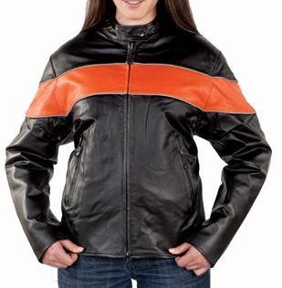 Womens Leather Motorcycle Jacket with Orange Racing Stripe, Insulated Zip Out Lining & Reflective Stripes Jackets, Womens Leather Motorcycle Jacket, Reflective Orange Stripe. Women's Jackets are made from Top Grade Genuine Leather. Ladies Jacket has Orange Reflector Stripe for Safer Riding at Night. Jacket features a Zip Out lining that runs through the sleeves - For Jackets best fit, order by chest size. Please use a cloth tape measure to measure the circumference of your chest / bust. Start from the center of your chest, run the tape measure under your arms around your back to the center of your chest. Measure fullest part of bust. When measuring jacket size, don't measure to tight, measure with your arms relaxed to the side. Add 1 inch to your final measurement. If you need further tips on measuring for a jacket, you can do a search for how to measure chest for a leather jacket and you will find some helpful hints, If you don't have a cloth Tape measure, you can use a string and compare the length to a tape measure in inches